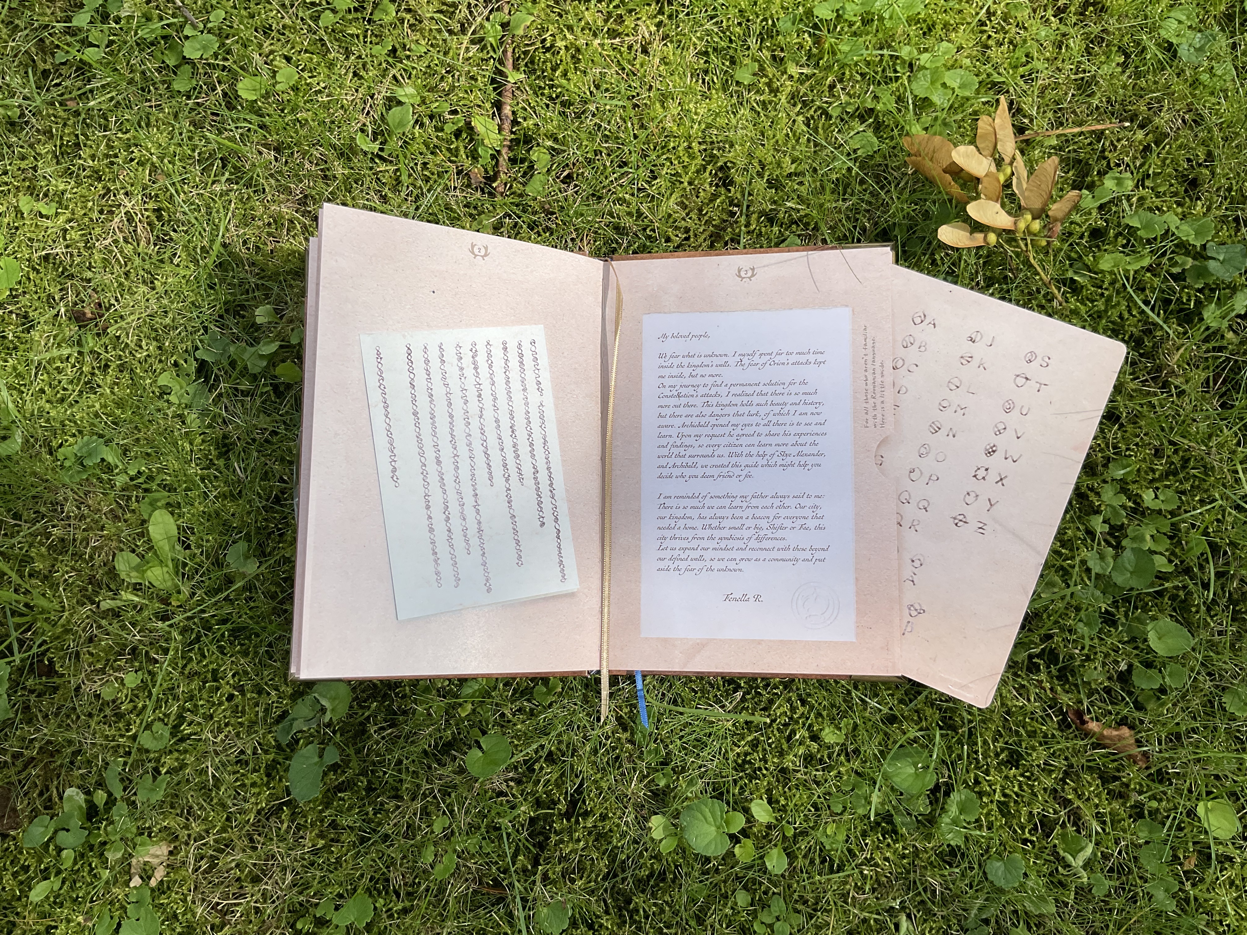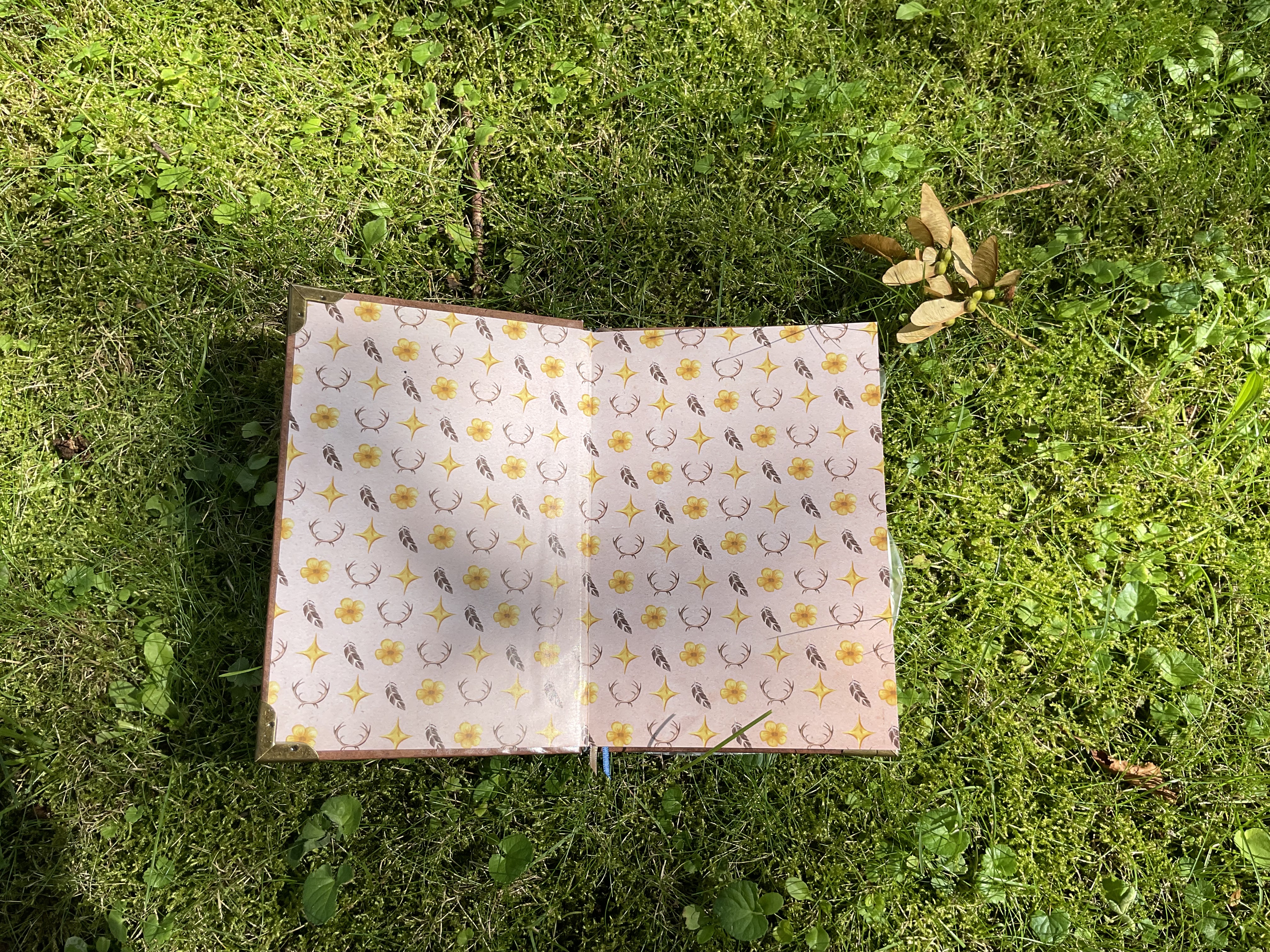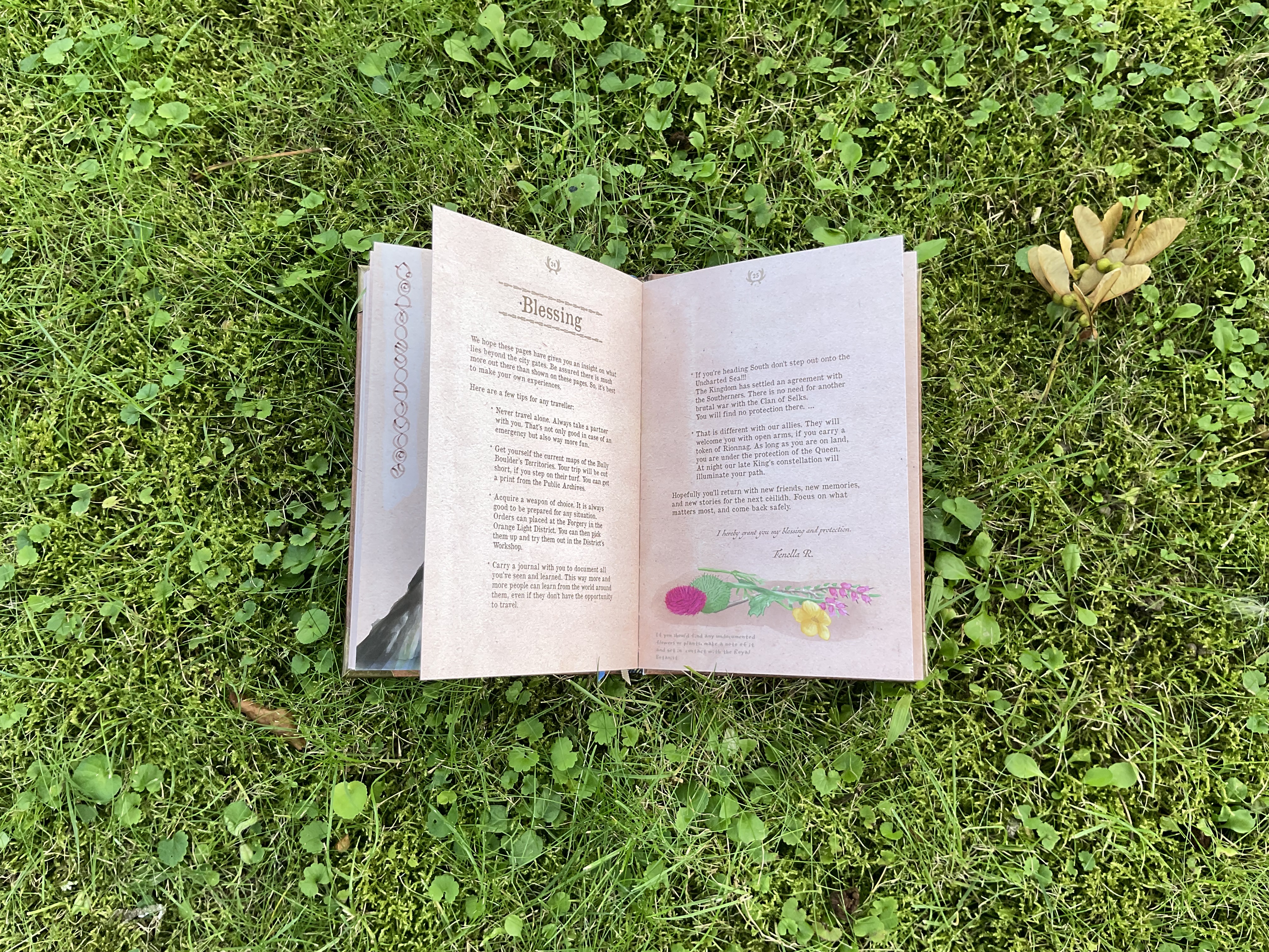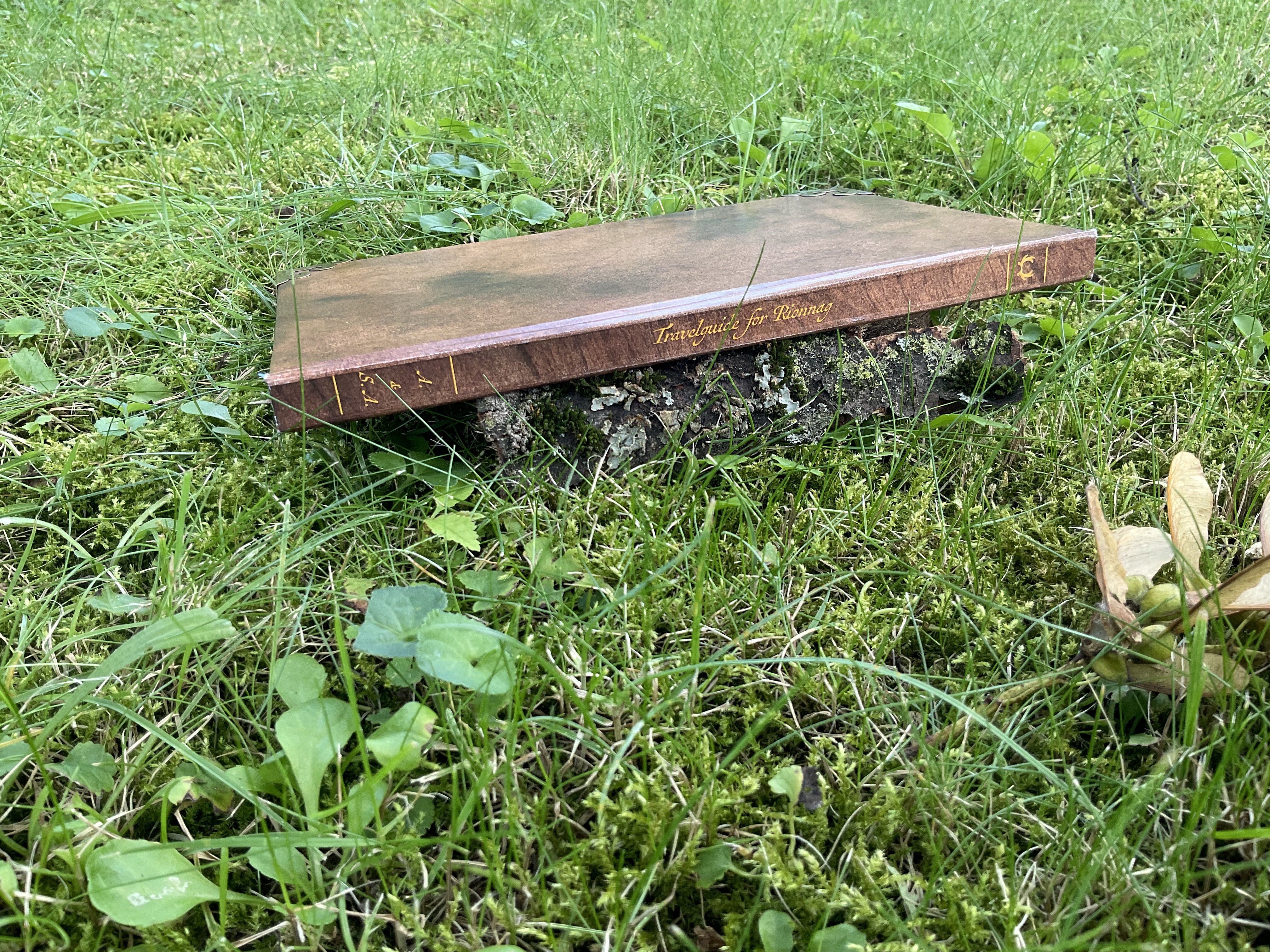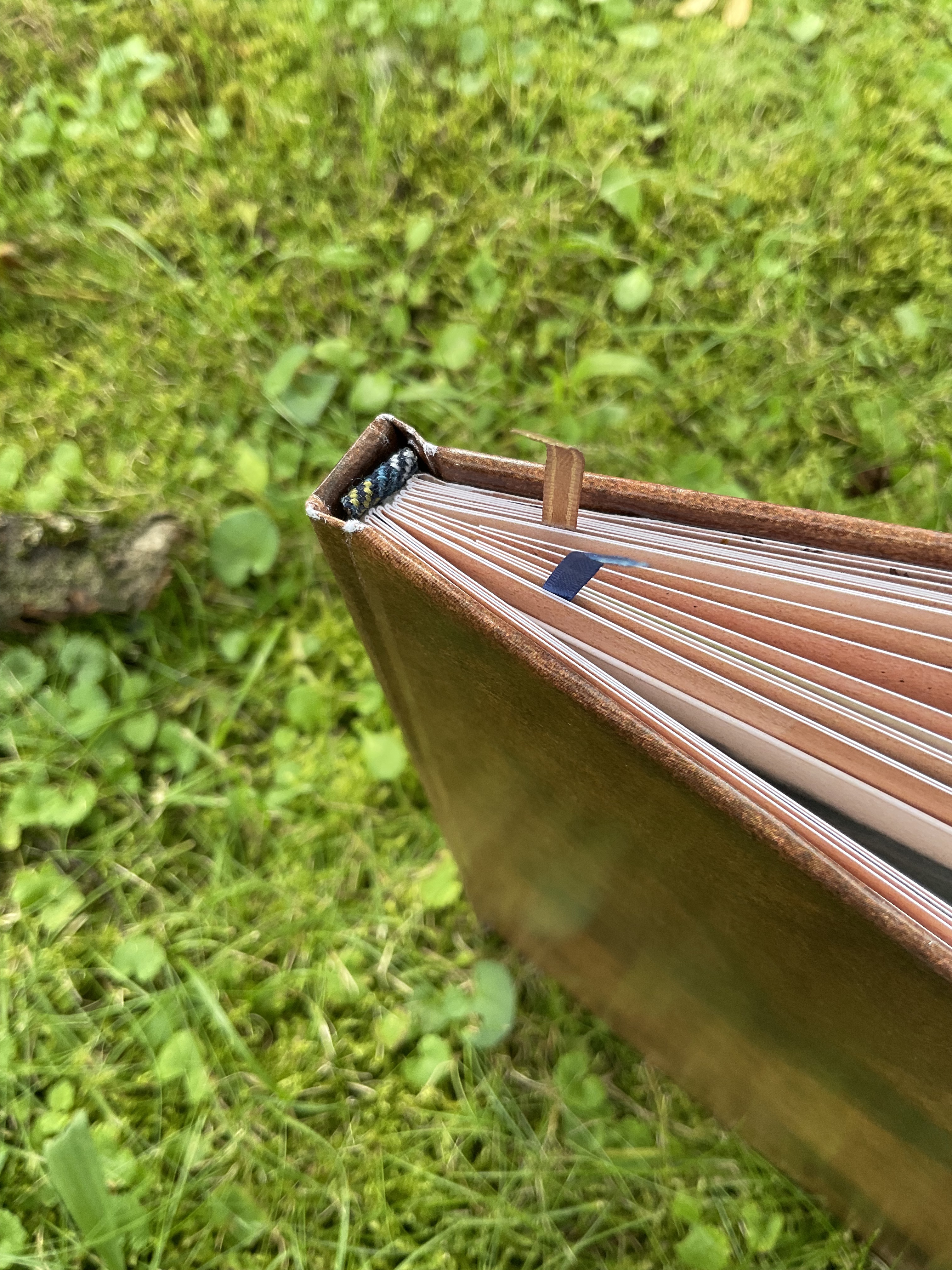My absolute favorite details about this book is the headband. It is self-made out of an original Tartan fabric, which I acquired on my first trip to Edinburgh. Depending on the pattern, the colours, the weaving, a Tartan can belong to a family, a clan or a royal house. The fabric used here is called “Holyrood”, named after the royal residence “Holyrood House” of King Charles, when he resides in Edinburgh. The book not only holds an actual piece of Scotland, but also a lot of history.