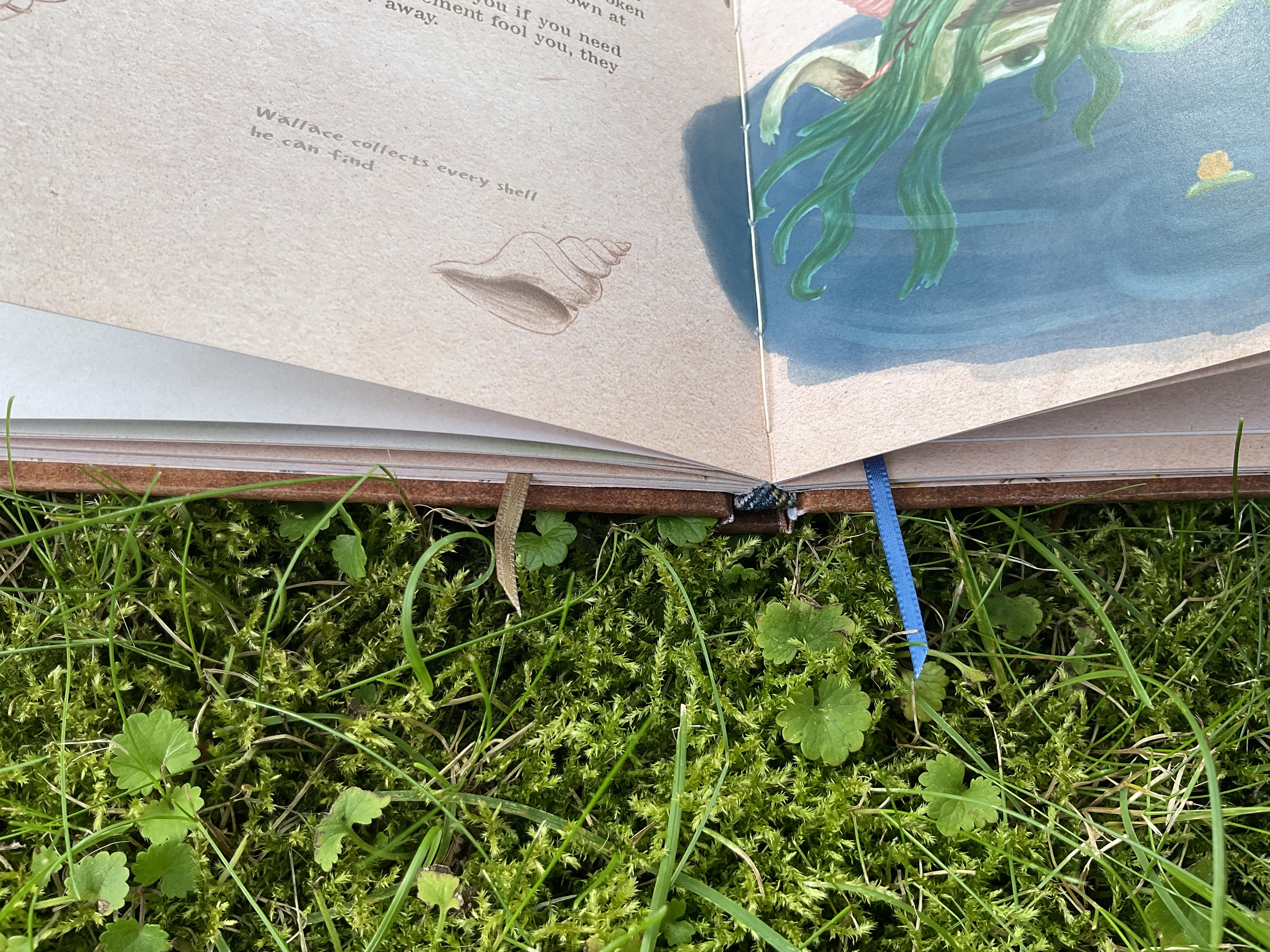 The pages were bound by hand, then glued together. I added two bookmarks. One, to reflect the colours of the inside of the book. The other, to harmonize with the headband and the illustrations.