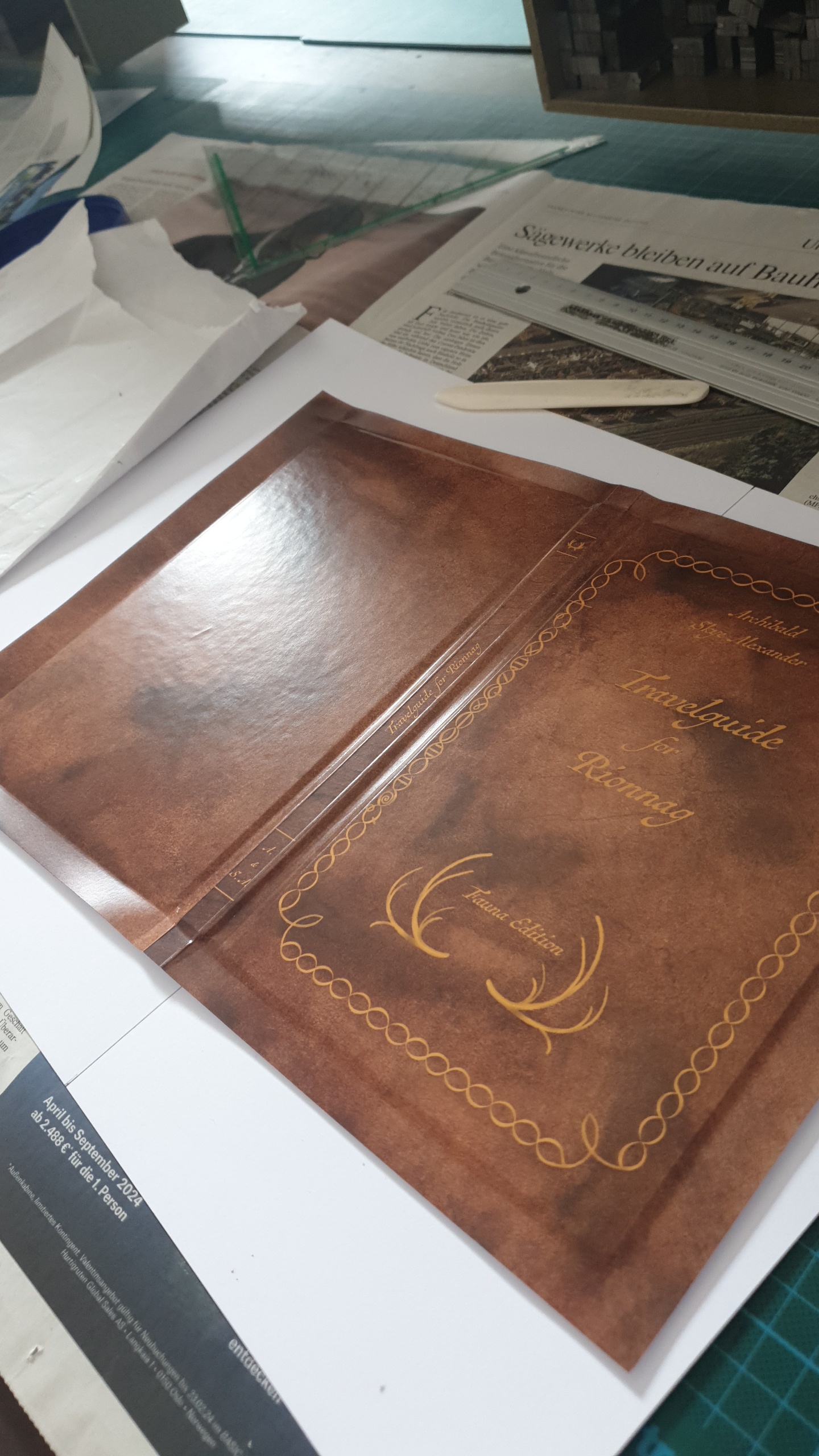 The binding was tricky at first, because I didn’t want to bind the book with either fabric or leather. Two malleable materials, which are more forgiven. In the end I tested different paper weights, to see what worked best. I was very careful not rip or scrape the paper while glueing it to the cardboards.